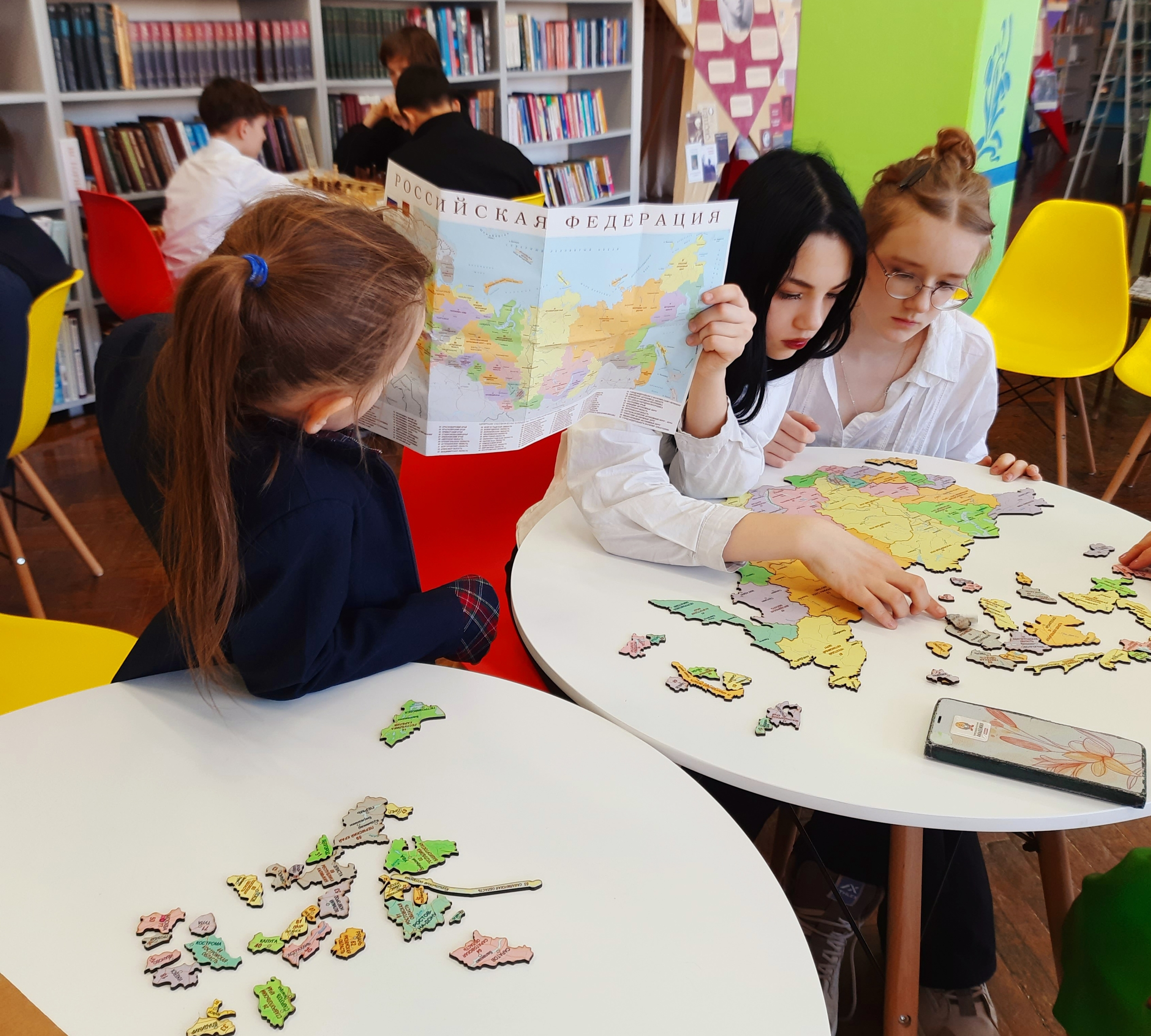 ????Те, кто увлечен географией, смогли проверить свои знания, собирая большой пазл с изображением карты России. В процессе игры ребята не только узнали названия регионов, но и запомнили их столицы.